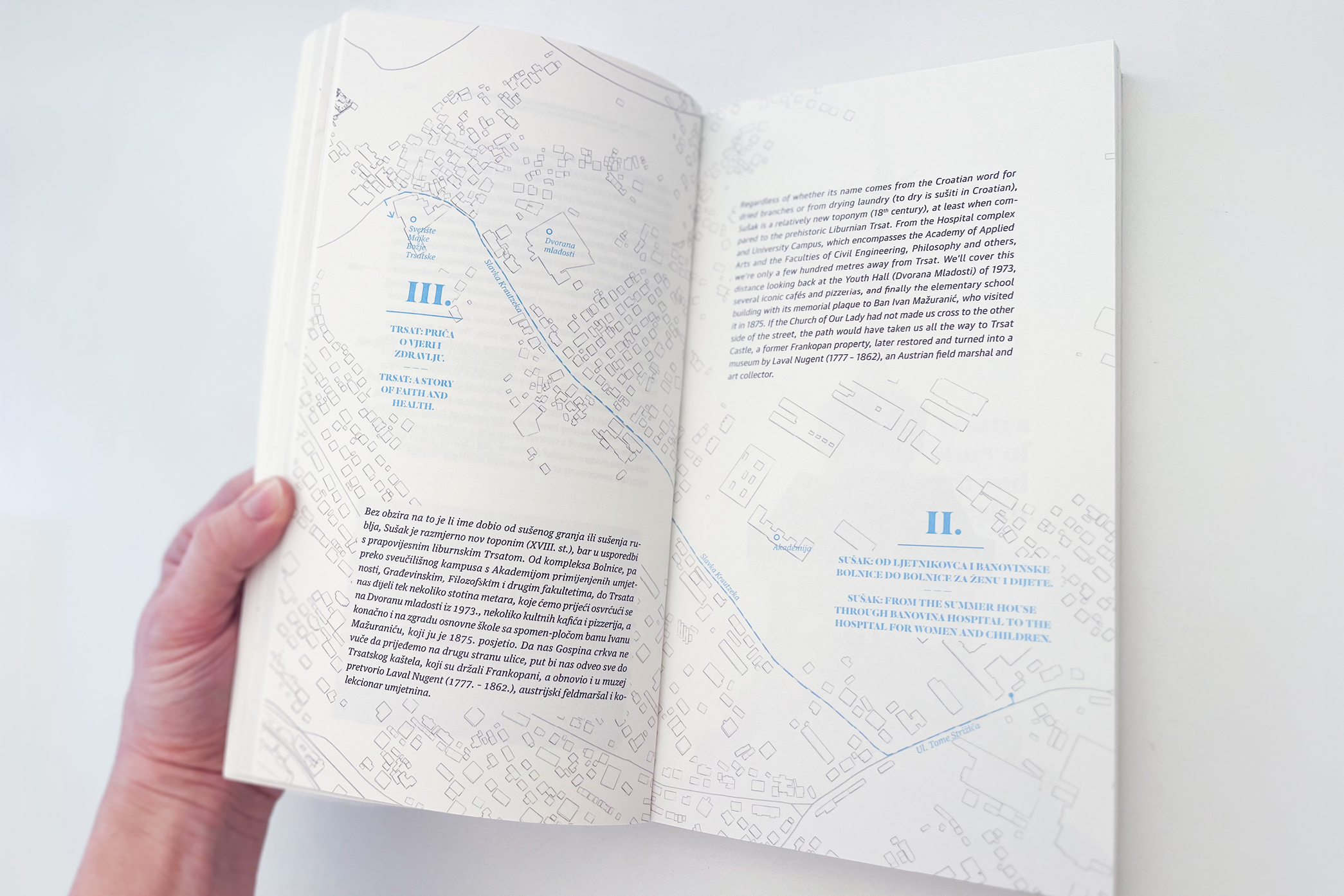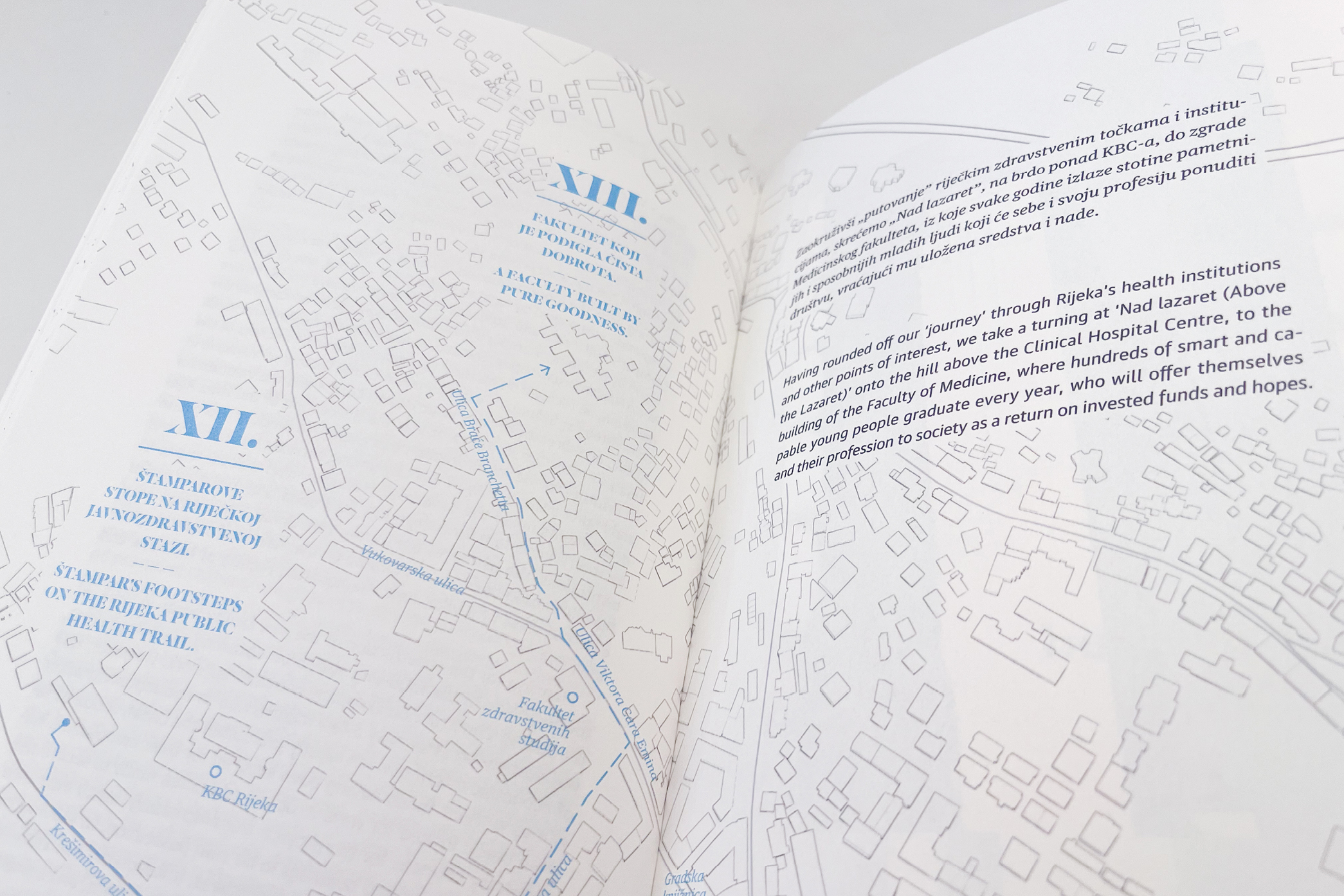 As much as we think we know our city, we always end up surprised how layered its history really is. It was such a delight discovering a historical-medical side of Rijeka, and an even greater one designing such a city guide. While creating A short & unpretentious historical-medical guide to Rijeka, we had to bring together three different types of content: the narrative, the city guide (maps) and the photographs. A great source of inspiration were old medical textbooks from which we borrowed some typography details. And we mustn’t leave out the wonderful photos by Ivan Vranjić, which look good even when we dissect them a bit. United under the concept “anatomy of the city” all these parts came together and resulted in a book we are quite proud of. How unpretentious of us.